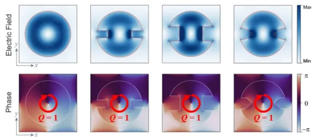 具有對結(jié)構(gòu)微擾免疫的拓?fù)涔舱衲J?。其電場分布在結(jié)構(gòu)中心呈現(xiàn)一個奇點,相位分布具有非平庸拓?fù)浜?,不受結(jié)構(gòu)微擾的影響。
